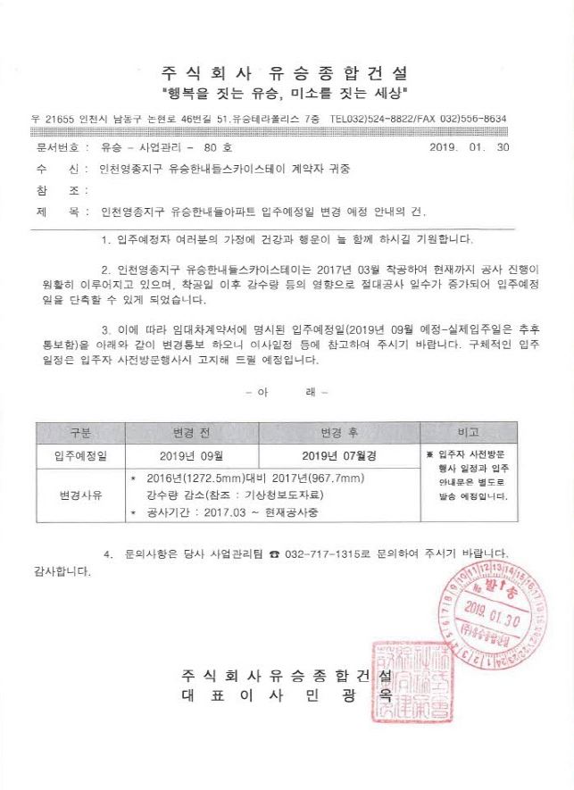 인천영종지구 유승한내들아파트 입주예정일 변경 예정 안내 작성일자 2019/01/30 첨부파일 인천 영종지구 유승한내들 아파트 입주 예정일 변경 예정 안내.JPG 본문 인천영종지구 유승한내들아파트 입주예정일 변경 예정 안내 입니다. 자세한 내용은 첨부파일을 확인 해 주시기 바랍니다. 목록